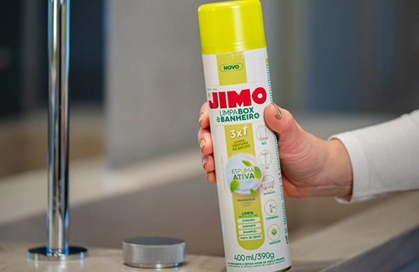 o JIMO Limpa Box & Banheiro é uma espuma multiuso em aerossol desenvolvida para limpeza das superfícies do banheiro. Ele remove resíduos de gordura, sabonetes, shampoos e pasta de dentes e possui uma fragrância leve e refrescante.